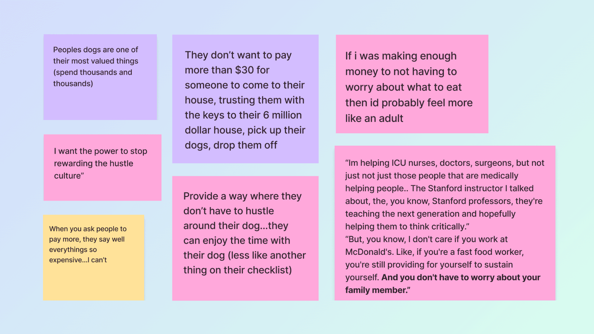 I shadowed professional dog walkers, interviewed them, walked dogs alongside them. The goal: understand a community through participant observation, not just interviews. We wanted to better understand the needs of professional dog walkers by gaining a better understanding of their lives, not just their jobs.